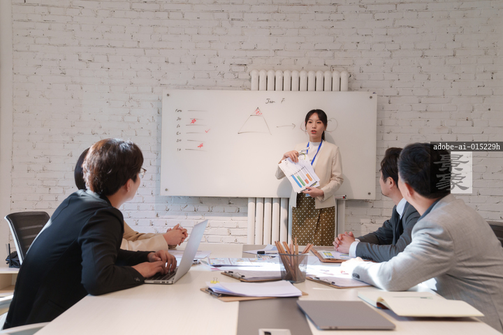 图片标题: 五个东方商务人士在会议室里开会,一位女职员在白板前演讲工作。