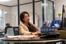 图片标题: 三位亚洲人在摄影棚里拍摄,化妆师在和模特沟通