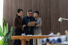 图片标题: 一位资深亚洲华裔服装设计师在工作室里认真工作