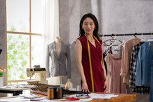 图片标题: 服装设计工作室里,一位年轻的亚洲华裔女服装设计师看设计图纸工作。