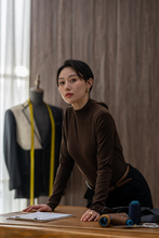图片标题: 服装设计工作室里,一位年轻的亚洲华裔女服装设计师喝咖啡思考设计方案。