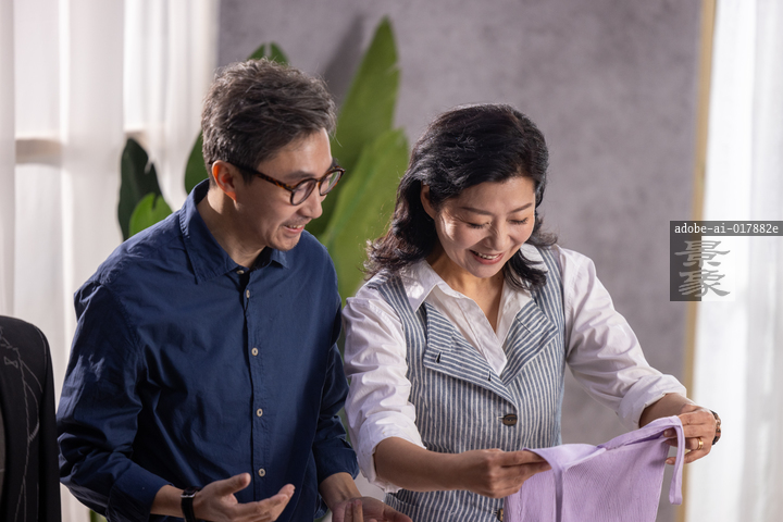 图片标题: 服装设计工作室里,两位亚洲服装设计师团队讨论工作。