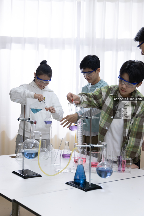 图片标题: 在中学生的化学课上,一位亚洲老师指导学生做化学实验