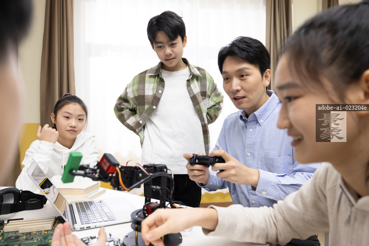 图片标题: 在中学生的编程课上,一位亚洲老师指导学生学习机器人编程
