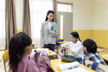 图片标题: 小学生教室里,一位亚洲青年老师请一位小学生站到黑板前发言