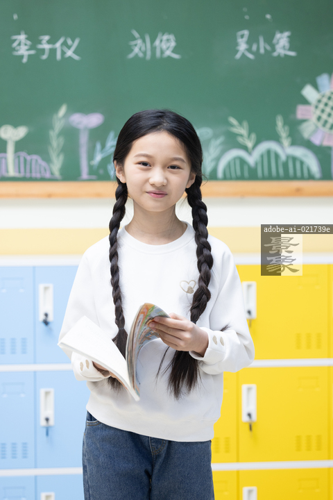 图片标题: 一位亚洲小学女生微笑的站在教室里