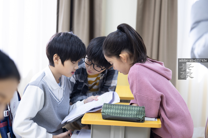 图片标题: 小学生的教室里,三位亚洲小学生交流学习
