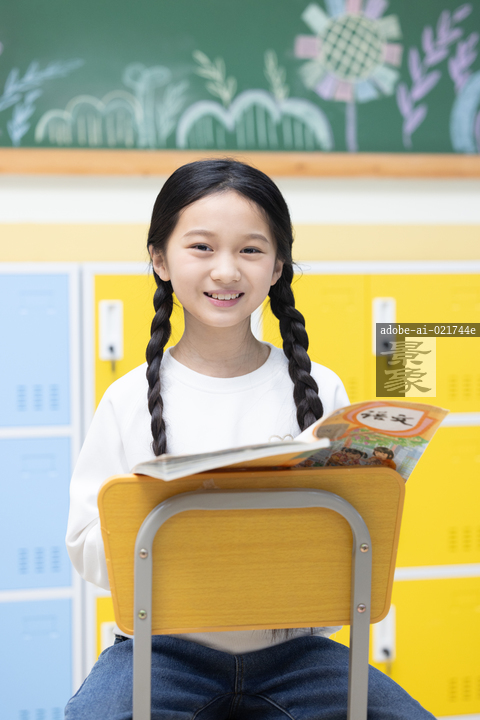 图片标题: 一位亚洲小学女生微笑的坐在教室里