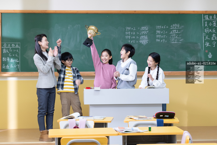 图片标题: 教室里,兴奋的小学生们高举奖杯欢呼跳跃