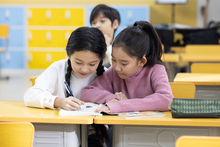 图片标题: 教室里,一位亚洲青年女教师辅导小学生们学习