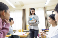 图片标题: 小学生的教室里,课间休息时间两位亚洲小学女生坐在座位上玩耍