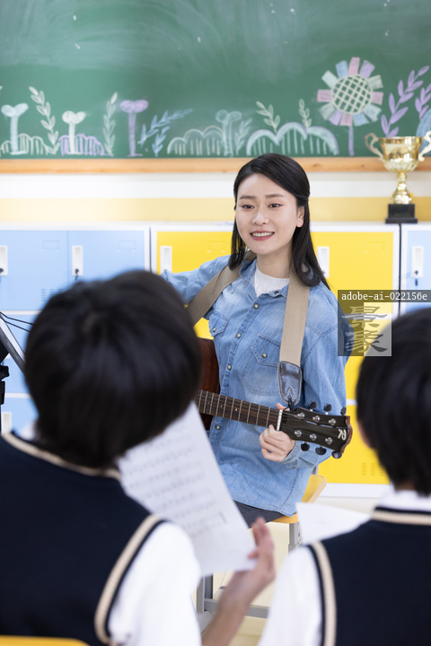 图片标题: 小学音乐课,一位亚洲女老师弹吉他教学生们唱歌
