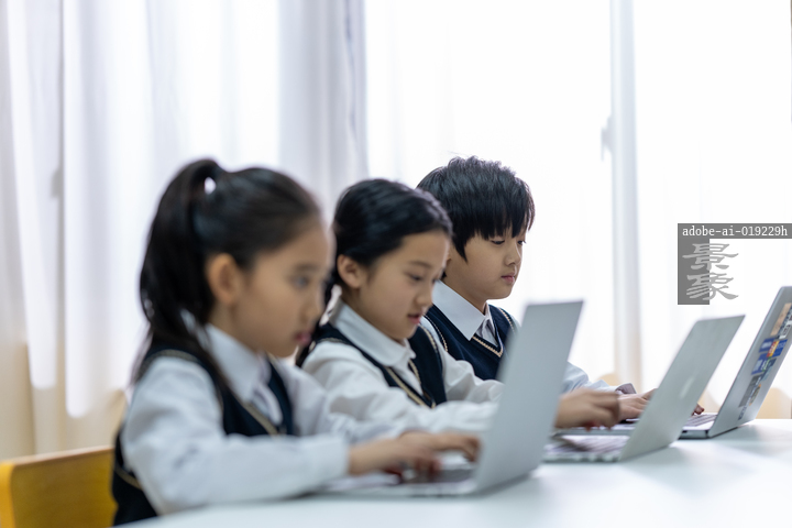 图片标题: 在小学生的计算机课上,三位亚洲小学生认真的使用笔记本电脑。