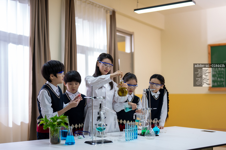图片标题: 实验室里,教师辅导小学生做科学实验。