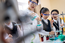 图片标题: 实验室里,教师辅导小学生做科学实验。