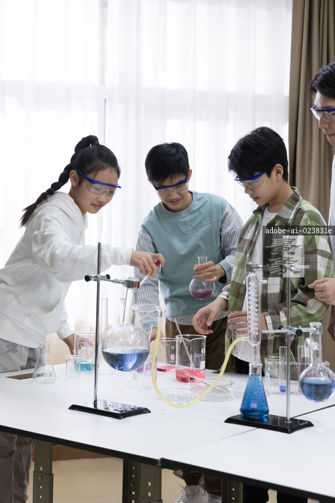 图片标题: 在中学生的化学课上,一位亚洲老师指导学生做化学实验