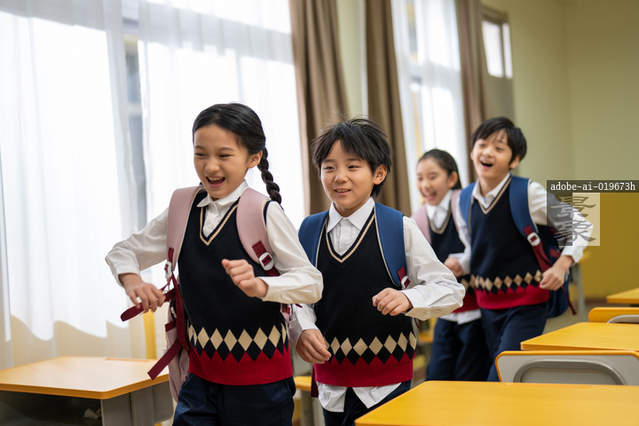 图片标题: 学校放学,小学生们背着书包高高兴兴的走出教室。