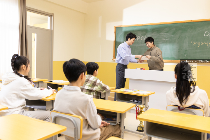 图片标题: 在中学英语课上,一位亚洲老师请学生站在黑板前颁发奖状