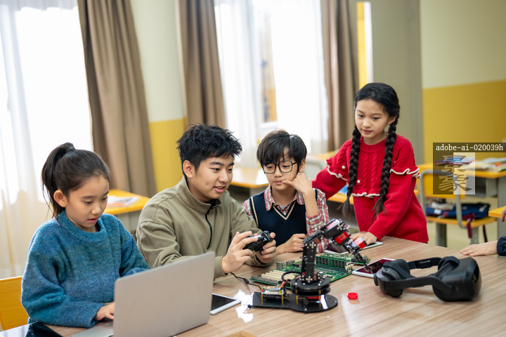 图片标题: 在小学生的编程课上,一位亚洲男老师教小学生们学习机器人编程。