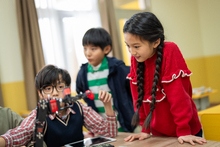 图片标题: 在小学生的编程课上,一位亚洲女老师教小学生们学习机器人编程。