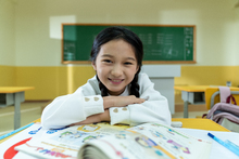 图片标题: 小学教室里,课间休息一位亚洲小学女生高高兴兴的坐在座位上。