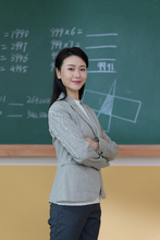图片标题: 小学教室里,一位亚裔青年女老师给获奖小学生颁发奖杯。