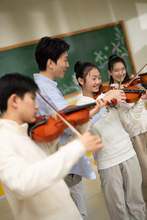 图片标题: 中学教室里,课间休息四位亚洲学生在教室里写作业讨论问题。