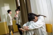 图片标题: 中学教室里,四位中学生在大扫除打扫卫生擦地。