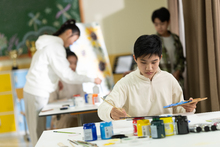 图片标题: 在中学美术课上,两位亚洲中学女生认真的上课画画。
