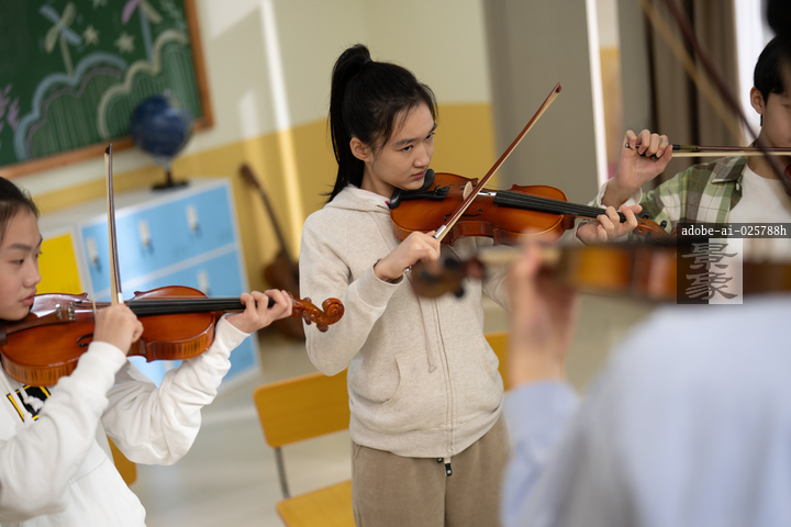 图片标题: 在中学生音乐课上,一位亚洲老师教学生们学习小提琴,学生们都很专注学习。
