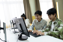 图片标题: 在中学生的化学课上,一位亚洲老师指导学生做化学实验。