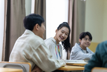 图片标题: 中学数学课上,一位亚洲老师在黑板前给同学们上课,课堂气氛轻松活跃。