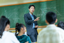 图片标题: 在中学生音乐课上,一位亚洲老师教学生们学习小提琴,学生们都很专注学习。
