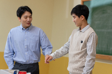 图片标题: 中学英语课上,一位亚洲青年男老师请一名男生站在黑板前发言。