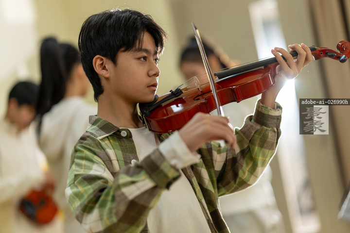 图片标题: 在中学生音乐课上,四位亚洲学生认真的学习小提琴,学生们都很专注学习。