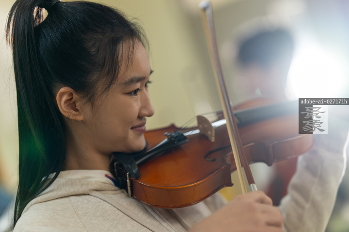 图片标题: 在中学生音乐课上,四位亚洲学生认真的学习小提琴,学生们都很专注学习。