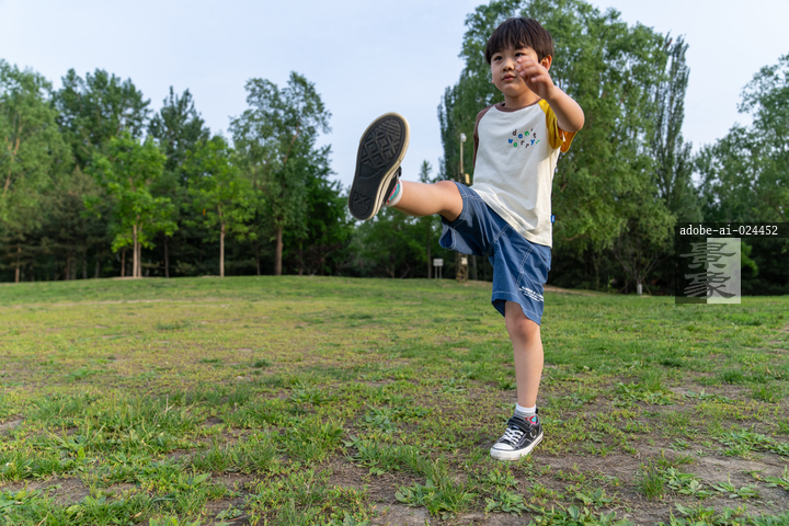 图片标题: 户外的草地上,一位亚洲华裔男孩踢足球