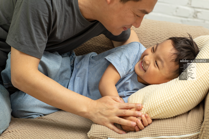 图片标题: 一位亚洲华裔男士和儿子,父子俩躺在沙发上玩耍