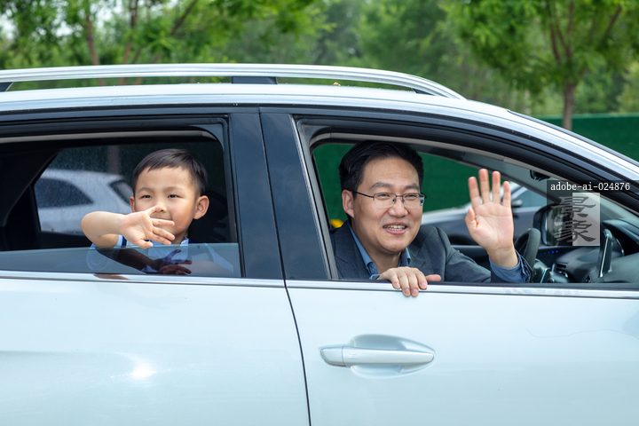 图片标题: 汽车内,一位亚洲华裔男士带着儿子出行