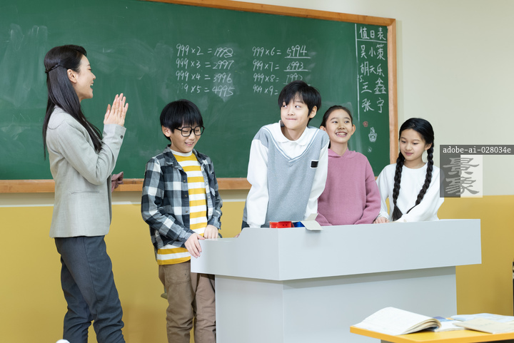 图片标题: 小学生教室里,一位亚洲青年女教师给学生们站在黑板前辅导学习