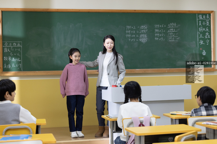 图片标题: 小学生教室里,一位青年老师请一名小学生站在讲台上发言