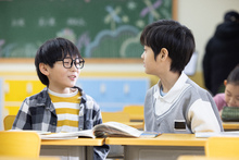 图片标题: 教室里,一位亚洲青年女教师辅导小学生们学习