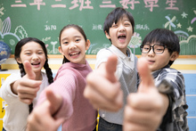 图片标题: 小学生的教室里,课间休息时间两位亚洲小学女生坐在座位上玩耍