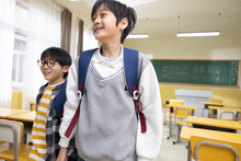图片标题: 小学生的教室里,课间休息时间两位亚洲小学女生坐在座位上玩耍