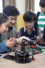 图片标题: 小学生教室里,一位亚洲青年女教师辅导学生们在黑板上做题
