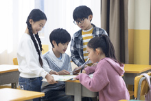 图片标题: 小学生的教室里,课间休息时间两位亚洲小学女生坐在座位上玩耍