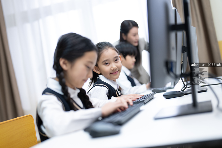 图片标题: 在小学生的计算机课上,一位亚洲青年女教师在给小学生们上课。