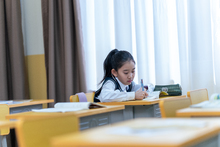 图片标题: 在小学生的教室里,一位亚洲女老师教小学生们玩益智玩具开发智力