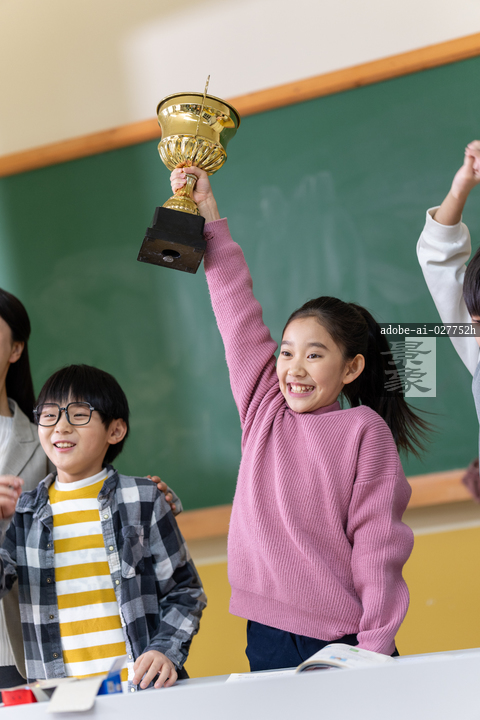 图片标题: 教室里,兴奋的小学生们高举奖杯欢呼跳跃。