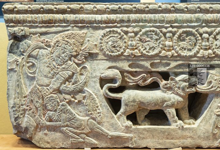 图片标题: 北京故宫五洲四海-一带一路文物考古合作展-北朝-隋彩绘贴金浮雕石床前档-北朝-隋-美国纽约曼哈顿区检察办公室返还(局部)